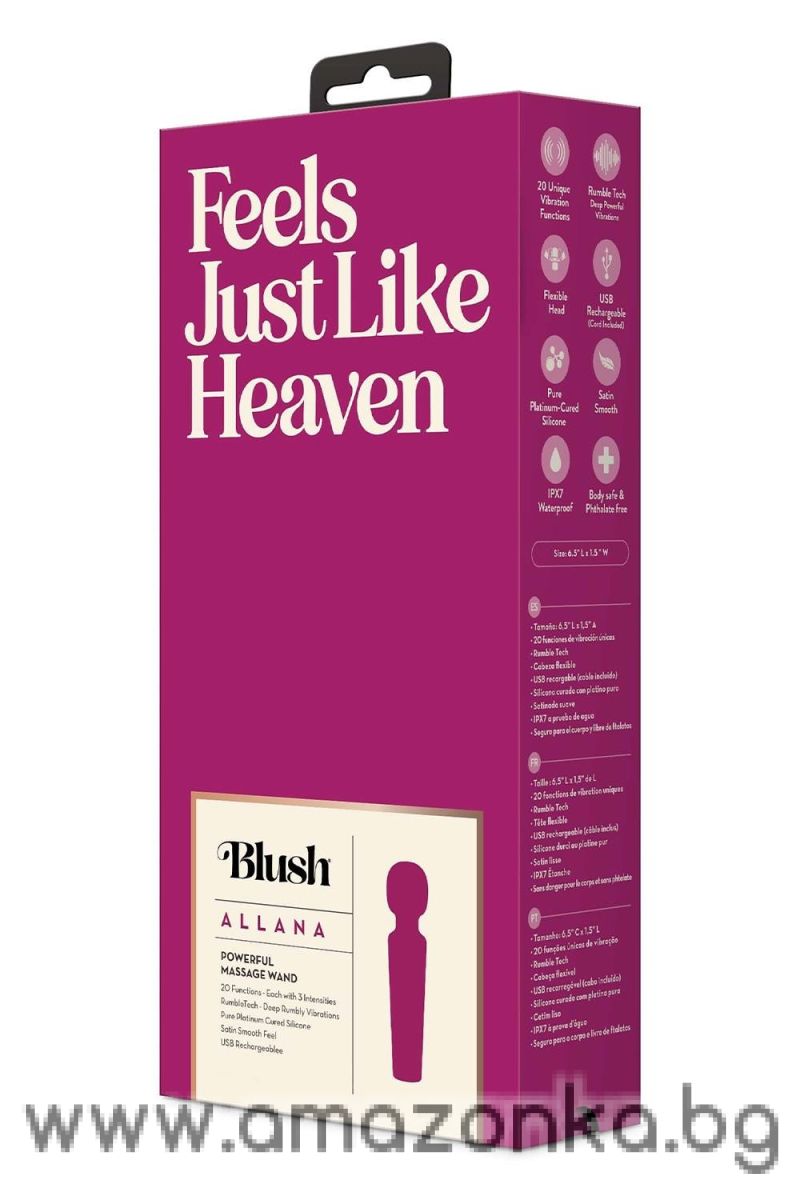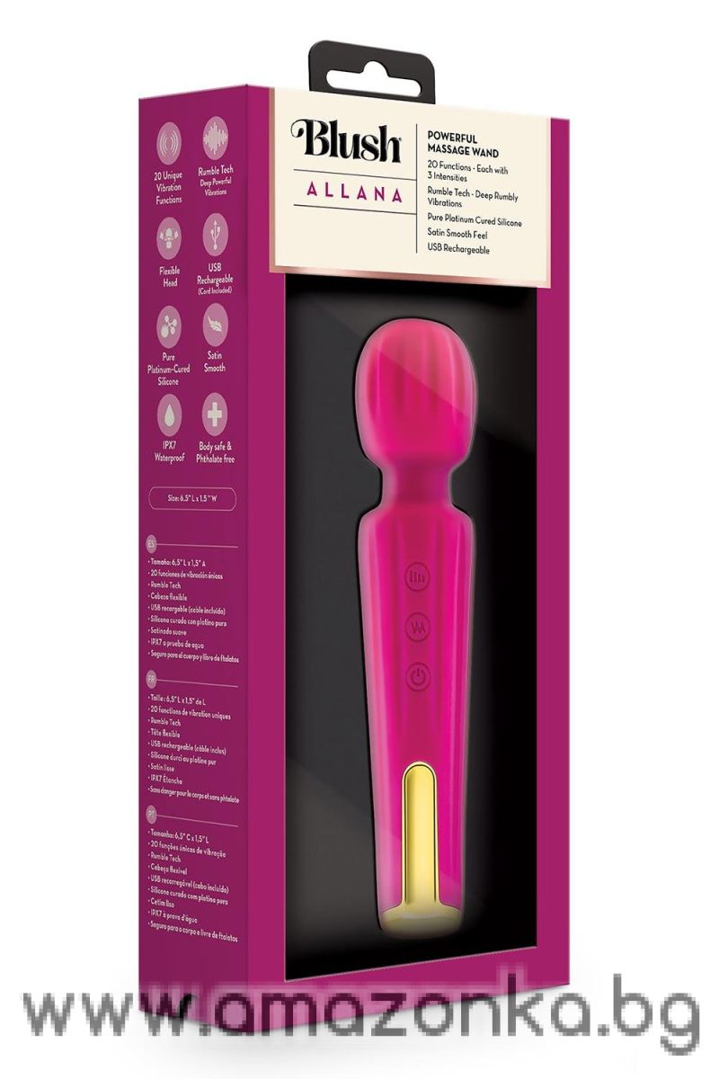 Blush Allana е мощна вибрационна пръчица с гъвкава глава, готова да ви наслади. Allana има 20 дълбоки, вибрационни функции и 3 скорости на вибрация, използващи мощния RumboTech™ мотор, който ще ви позволи да изследвате широка гама от опции, всички фокусирани върху вас. Allana се усеща пищно върху кожата и е идеална за масаж. Тази USB презареждаща се пръчица е също така водоустойчива за забавление във ваната и душа! Allana е изработена от сатенено гладък платинено-втвърден силикон и ABS пластмаса. Allana е безопасна за тялото, без фталати, без аромат и лесна за почистване.