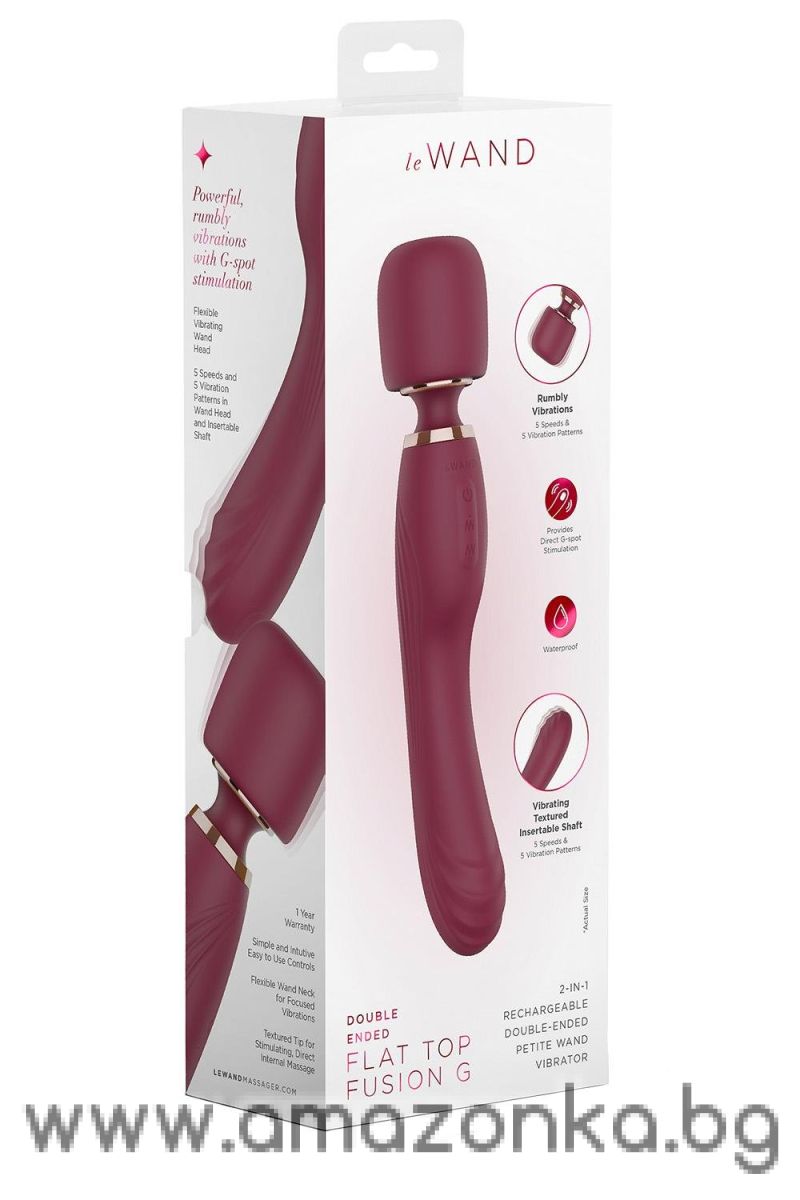 Le Wand Flat Top Fusion G е универсален вибратор с двойно предназначение, предназначен както за широка външна стимулация, така и за целенасочено удоволствие от G-точката. С плоска, гладка глава, той функционира като класически масажор тип пръчка за игра с цялото тяло или външни ерогенни зони, докато извитата, ергономична дръжка съдържа вътрешен вибратор за G-точката за дълбоко, прецизно удоволствие.