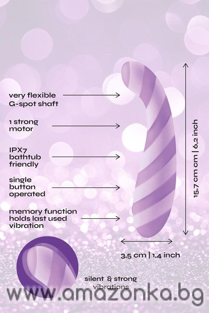 Дължина: 15,7 см Диаметър: 3,5 см Много гъвкав G-точков вал 1 мощен мотор Подходящ за вана IPX7 Работи с един бутон Функцията за памет запазва последната използвана вибрация