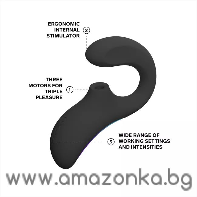 Как работи тройната стимулация С патентована технология WaveMotion™ и три синхронизирани мотора, ENIGMA Wave™ се движи като фина вълна, съчетавайки задоволителна вътрешна стимулация с дразнещо забавни, дълбоки усещания. Реалистично имитира движение, подобно на пръст, като вмъкнатата опашка се върти вътре във вас, като едновременно с това пренася вибрациите от главичката, носейки удовлетворение на G-точката. Първият мотор е отговорен за вътрешна вълнова стимулация, вторият за сензационни вибрации, а третият, използващ технологията SenSonic™, за осигуряване на звукови импулси, които резонират дълбоко във вътрешната структура на клитора за изцяло ново усещане.Material: Body-safe silicone, ABS plastic Color: Black, Cyber Purple Interface: 3-buttons and 2 LEDs Switch off: Automatic after 20 minutes Frequency: - Wave motor: 65 Hz - Vibration motor: 130 Hz - Gear motor: 1.3 Hz Battery: Li-ion 850 mAh 3.7 V User time: Up to 2 h Standby time: Up to 90 days Size: 106 x 50 x 182 mm / 4.2 x 1.9 x 7.1 in Insertable length: 140 mm / 5.5 in Weight (only product): 201 g / 0.44 lb