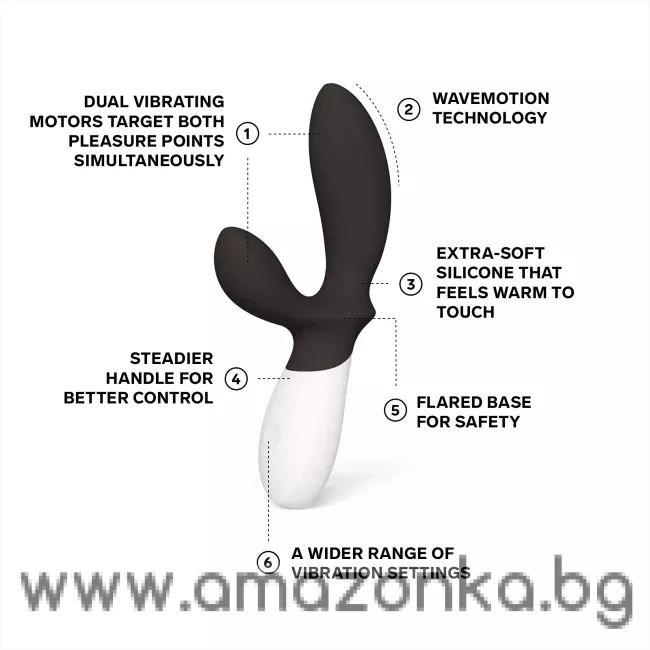 LOKI Wave™ 2 е мощен масажор за простата с 12 настройки за удоволствие, идеален за дръзка самостоятелна или двойна игра. Той използва емблематичната технология WaveMotion™ на LELO, за да осигури дълбок и зрелищен масаж, подобен на масаж с пръсти, като едновременно с това използва по-малкия накрайник за стимулиране на перинеума. LOKI Wave™ 2 е изцяло водоустойчив и покрит с първокласен, безопасен за тялото силикон, превръщайки най-ярките ви оргазмични мечти в реалност с лекота.