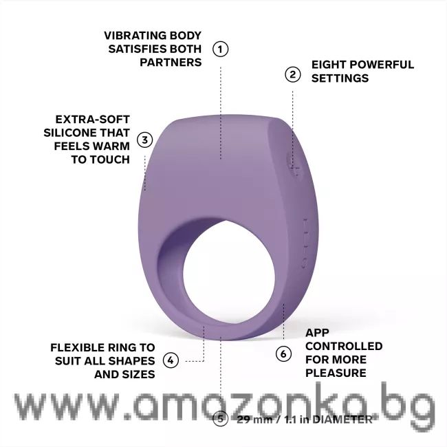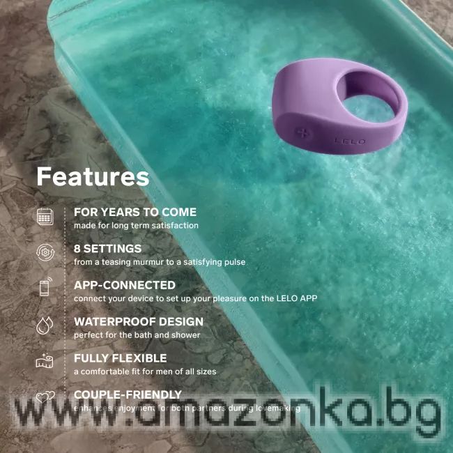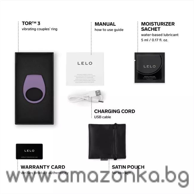Първична обич Направете следващата голяма стъпка във връзката си и си осигурете голямо взаимно удовлетворение с пръстена за удоволствие TOR™ 3. Повече настройки на вибрациите означават повече място за експериментиране, заедно с уникални опции за персонализиране с помощта на приложението LELO. TOR™ 3 е изработен от първокласен силикон, безопасен за тялото, което го прави идеално прилягащ за всички форми и размери, като идеално предава усещанията и на двамата партньори. ИЗТЕГЛЕТЕ ПРИЛОЖЕНИЕТО ЗА IOS/ANDROID Задоволете сексуалното си любопитство и разгърнете устройството си LELO. Приложението LELO е многофункционален център за сексуално благополучие, посветен на човешката сексуалност, пълен с над 4000 статии, ярка еротична литература и ценни съвети за връзки. То ви дава и по-голям контрол върху нашите свързани с приложението устройства, позволявайки пълно персонализиране на удоволствието за наистина уникално преживяване. Приложението LELO събира ограничени данни, за да подобри производителността и да подобри вашето преживяване. Това включва анонимни подробности за употреба, като например колко често отваряте приложението, колко дълго го използвате и кои функции се използват най-много. В зависимост от вашето устройство, приложението може също да събира данни за активност – като продължителност на сесията или статистика за упражненията – за да показва обобщения, да проследява напредъка и да персонализира вашето преживяване. Материал: Безопасен за тялото силикон, ABS пластмаса Покритие: Гладко Размер: 46.7 x 22.2 x 60 мм / 1.84 x 0.87 x 2.4 x инча Диаметър: 29 мм / 1.1 инча Батерия: Литиево-йонна 3.7V със 70mAh Зареждане: До 2 часа при 5.0 V 70 mA Номинална мощност: Вход 5V 0.35W Изход 3.7V 0.24W Време за работа: До 2 часа Режим на готовност: До 90 дни Честота: 130Hz Изключване: Автоматично след 20 минути Максимално ниво на шум: 60dB Интерфейс: 2 бутона