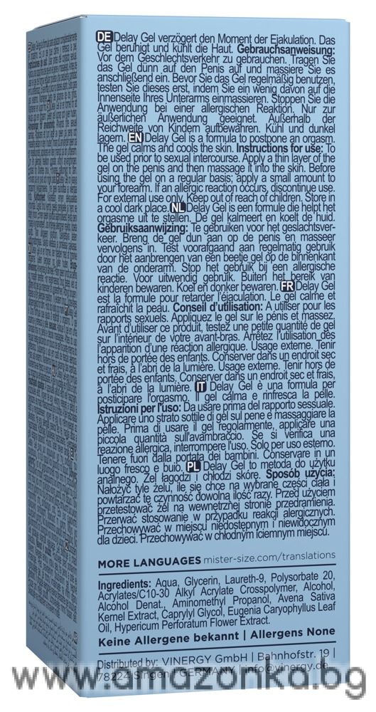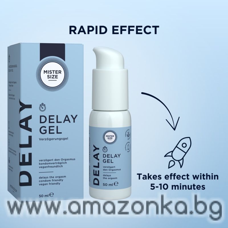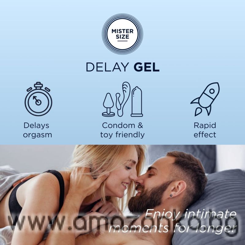 Delay Gel от Mister Size помага на мъжете да удължат сексуалното си удоволствие, без да жертват спонтанността или усещанията. Забавящият гел комбинира ефективни, натурални съставки с формула, щадяща кожата. Маслото от карамфил и laureth-9 могат да намалят чувствителността с цел забавяне на оргазма.