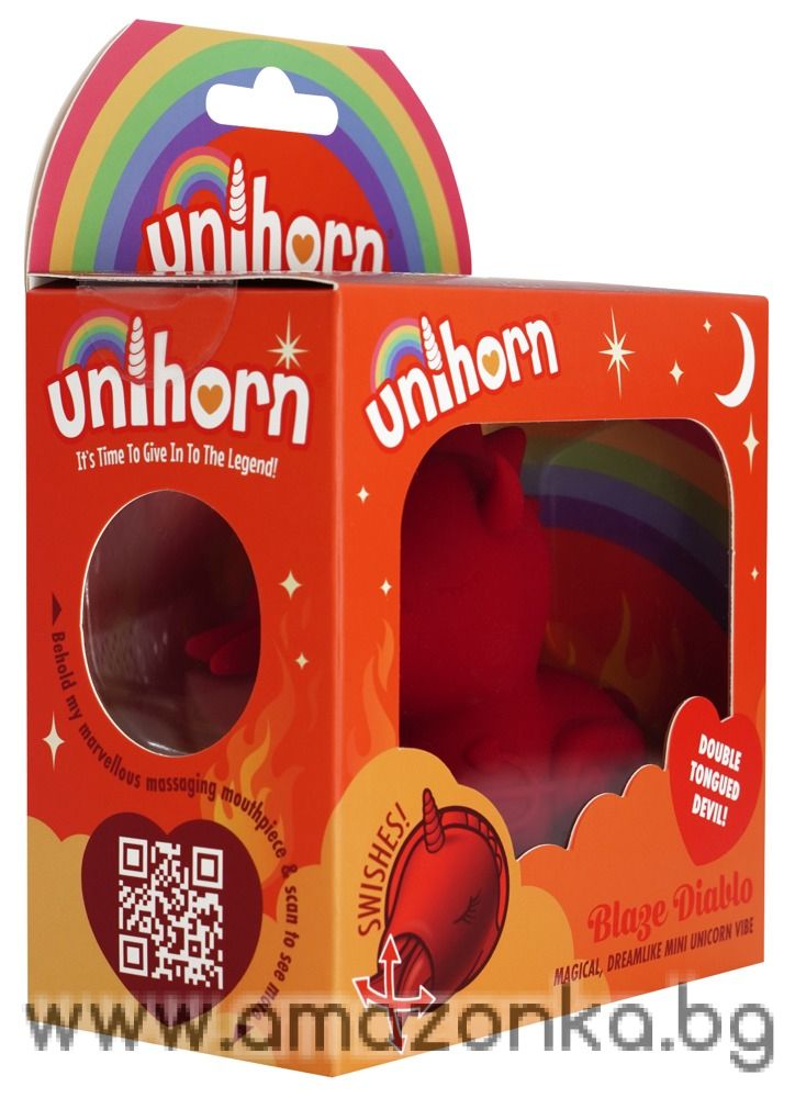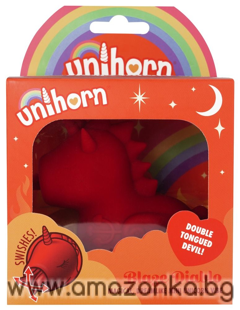 Cute Blaze Diablo (Swishing Tongued Vibrator) – вибратор за поставяне върху тялото от Unihorn, оформен като малък еднорог. Меката, удобна за захващане силиконова секс играчка осигурява „размахваща магия“ между бедрата. Нейното меко, малко, двойно езиче се движи изключително бързо нагоре-надолу и напред-назад, за да доставя удоволствие на клитора.