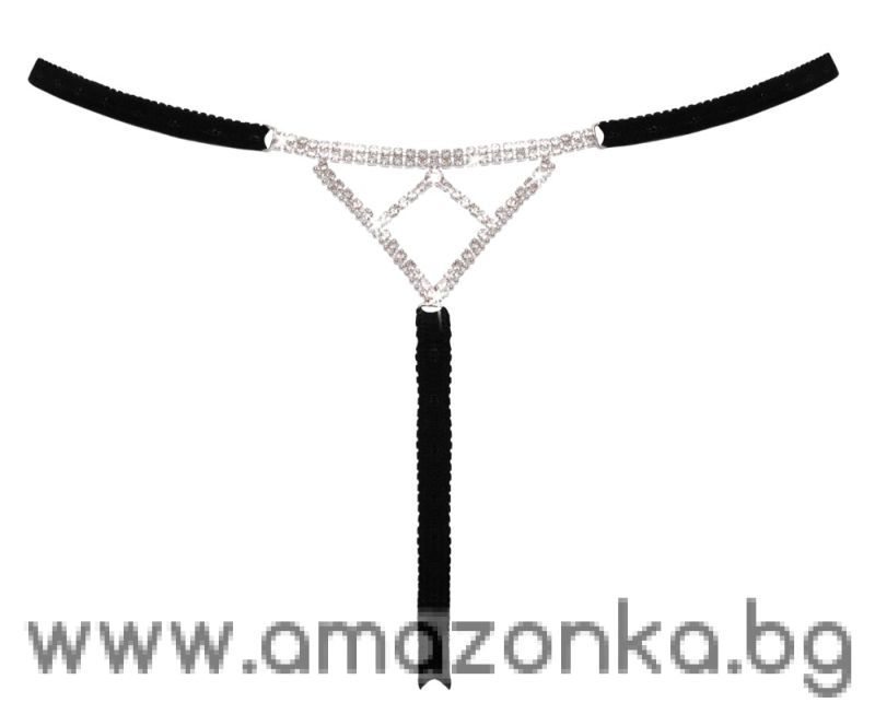 Елегантен черен стринг без дъно с бляскави кристали отпред и отзад. Регулируем колан за перфектно прилягане и максимално съблазнителна визия.