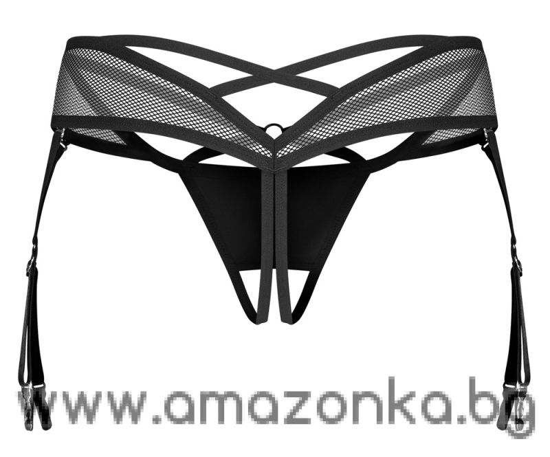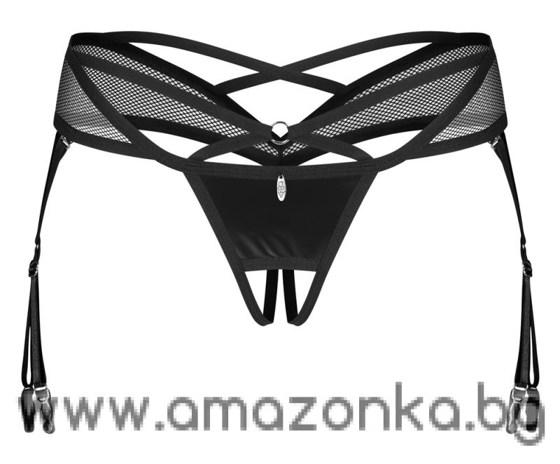 Черен стринг без дъно с жартиери Dominna от Obsessive е изработен в стилен микс от деликатна мрежа и секси wetlook материал. Декоративният пръстен и малкият елемент отпред придават изтънчена нотка. Кръстосаните жартиерни ленти отстрани са много ефектни. Четирите жартиерни ленти могат да се регулират и свалят според нуждата. Стрингът е също съблазнително без дъно.