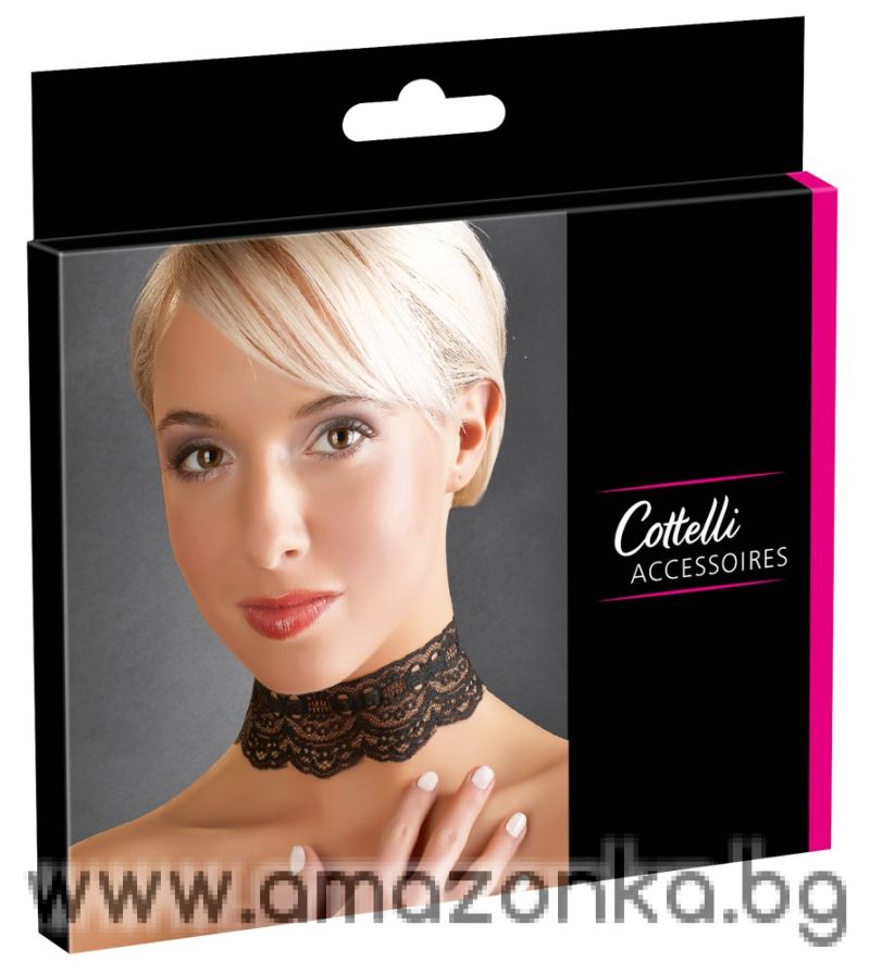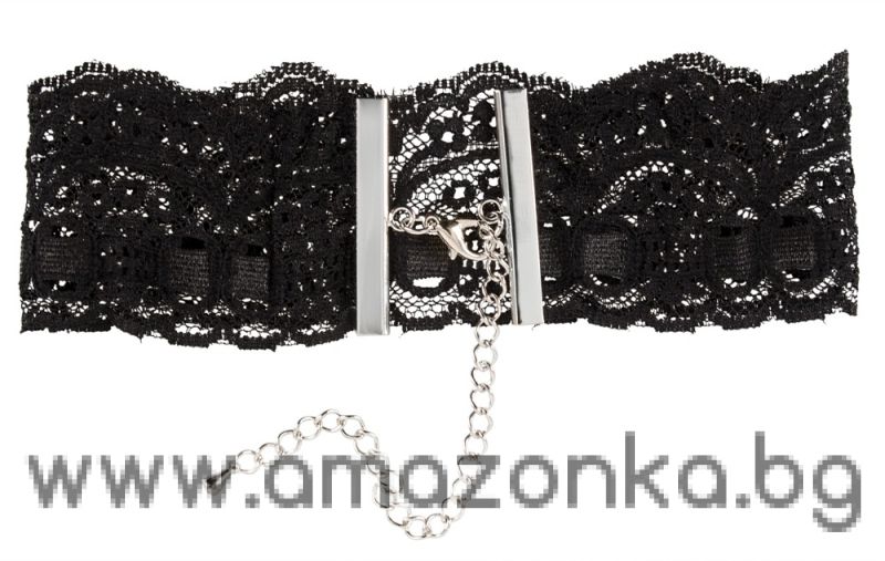 Елегантен черен чокър от дантела с вериги и регулируемо закопчаване – съблазнителен аксесоар за всяка визия.