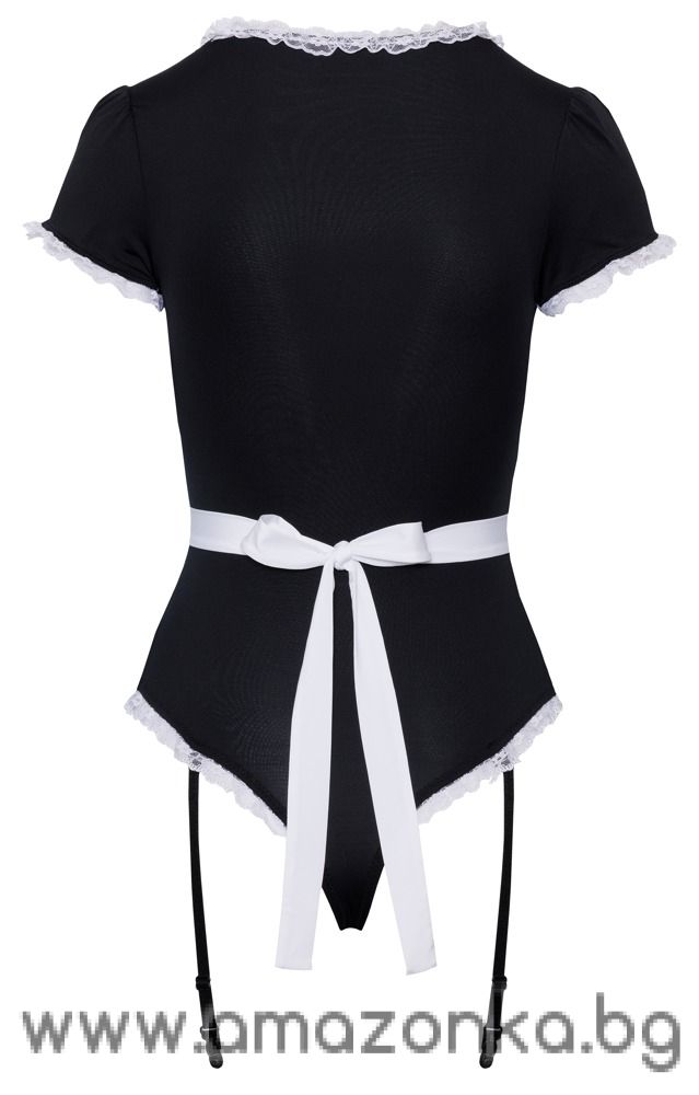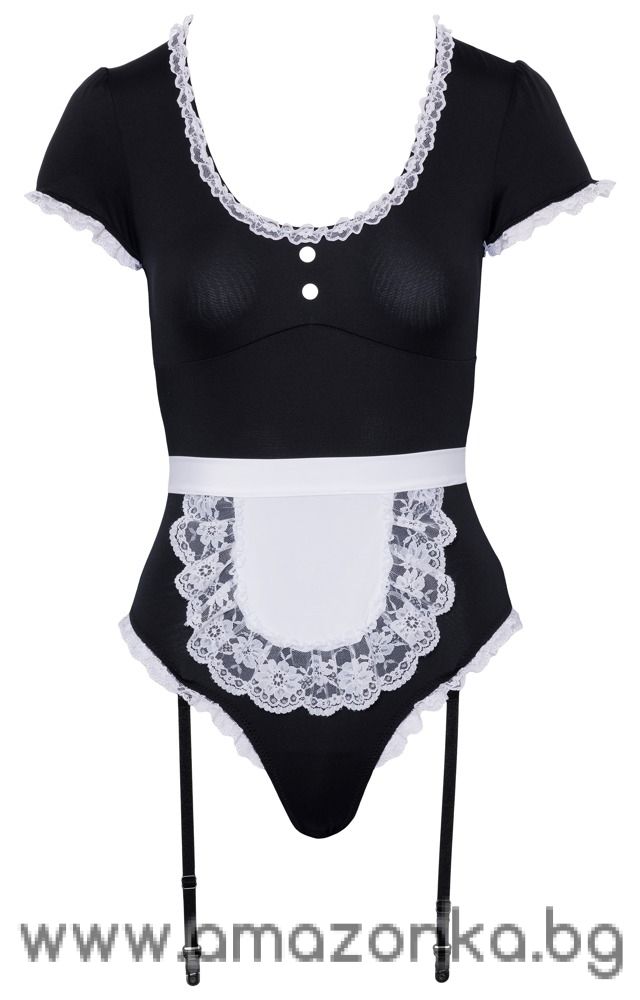 Боди с жартиери и престилка • Секси сервитьорски стил • Декоративни дантелени къдрички • Регулируеми и свалящи се жартиери • Тик-так копчета в чатала • Меко и еластично за висок комфорт Секси визия на сервитьорка! Това боди с жартиери и престилка от Cottelli COSTUMES е изработено от мек и еластичен черен материал. Отличава се със стилни бели дантелени къдрички около дълбокото деколте, късите ръкави и високата линия на крачолите. Две малки бели декоративни копчета отпред допълват типичната сервитьорска визия. В чатала има практични тик-так копчета. Жартиерите са регулируеми и могат да се свалят. Включената бяла престилка с дантелена къдричка се завързва отзад. Материал: Боди: 86% полиестер, 14% еластан Престилка: 95% полиестер, 5% еластан