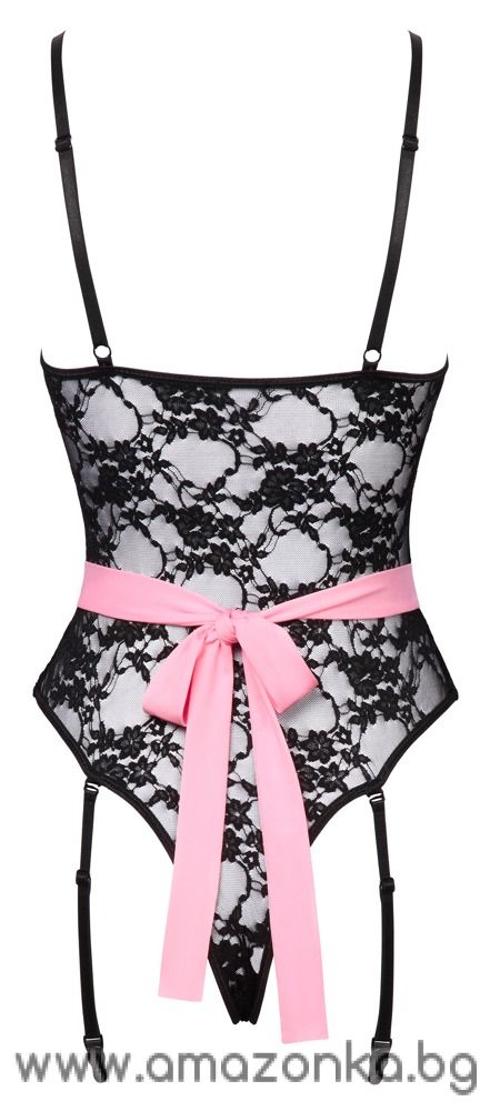 Дантелено боди с жартиери и престилка • Слугински стил с малка връзваща се престилка • Регулируеми и свалящи се жартиери • Регулируеми презрамки • Съблазнително отворено в чатала • Меко и еластично за висок комфорт Винаги на разположение! Отворено боди с жартиери и включена престилка – костюм „камериерка“ от Cottelli COSTUMES. Меко и еластично боди от красива черна дантела с малки розови копчета при деколтето. Презрамките се регулират за перфектно прилягане, а жартиерите са напълно свалящи се. Съблазнително отворено в чатала. Малката розова престилка допълва закачливата визия. Материал: 90% полиамид, 10% еластан