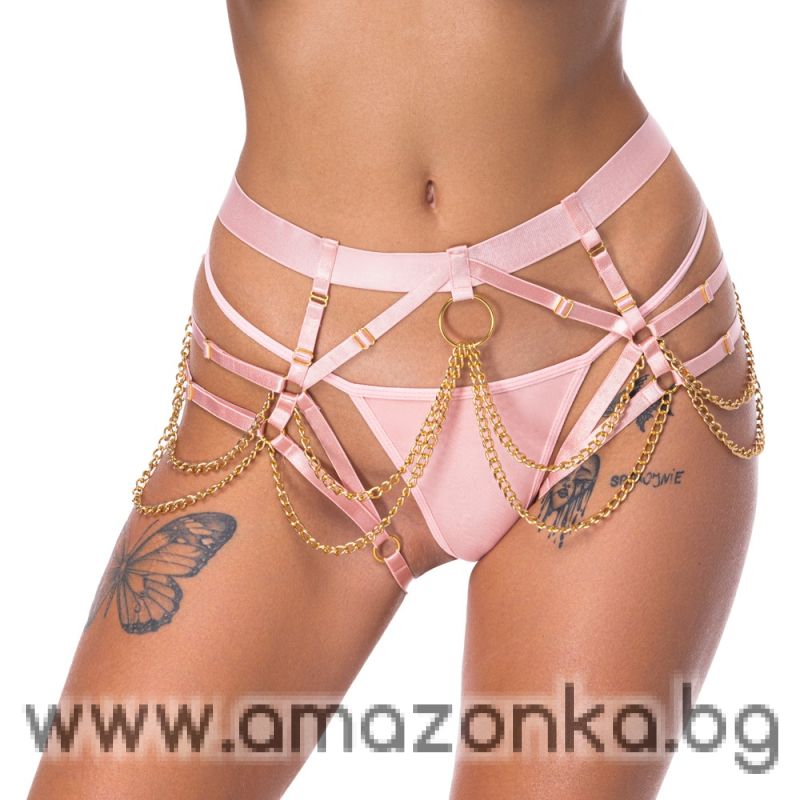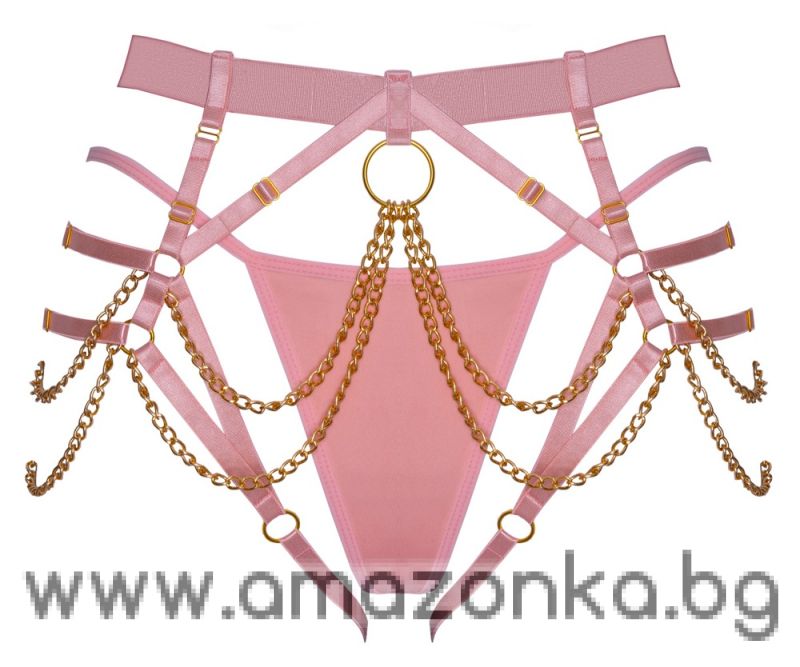Екстравагантен harness стринг от Bad Kitty, включващ и мини G-стринг. Харнесът е изработен от елегантно блестящи, розови, еластични ленти със златисти метални детайли. Люлеещите се синджири отпред и отстрани подчертават гламурния характер на бельото и добавят изключително секси акцент. Меките, еластични ленти и по-широкият колан на талията могат да се регулират за перфектно прилягане. Включен е и розов мини G-стринг за по-малко разкриваща визия.