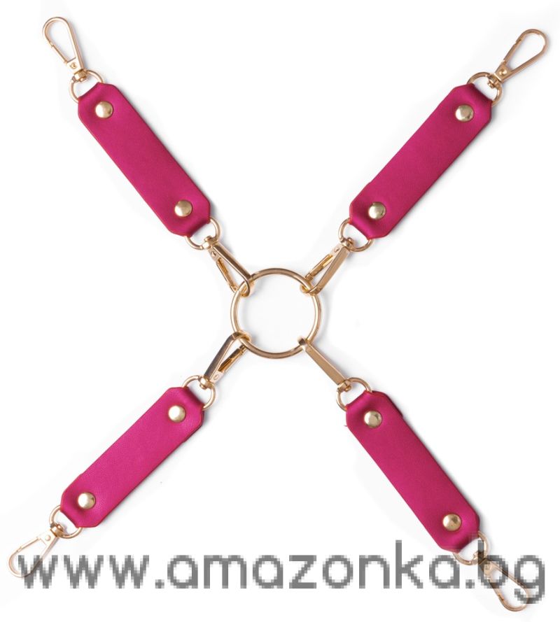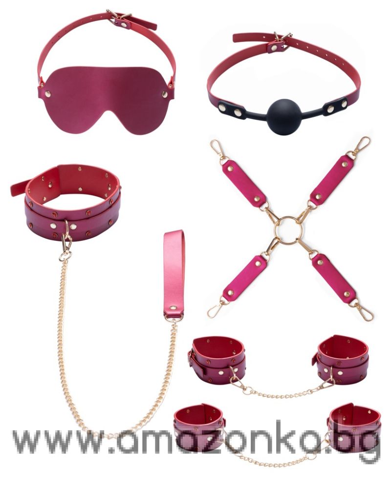 6-членният комплект от Bad Kitty е изработен от деликатна розова имитационна кожа с елегантен гланцов перлен ефект. Комплектът включва златисти декоративни елементи, синджири и блестящи кристали, които подчертават модния и гламурен вид. Стилен комплект за bondage както за любопитни, така и за опитни почитатели – включва повод, маска за очи и силиконов гаг за разнообразни и нестандартни игри. Комфортните ленти за глава и маншетите се поставят бързо и се регулират с катарамите. Всички синджири с карабинери могат да се свалят.