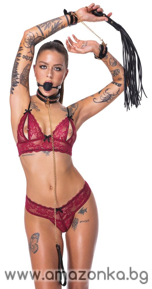 6-членният bondage комплект от Bad Kitty е изработен от елегантна черна имитационна кожа с златисти аксесоари и червени детайли. Висококачествен комплект за любопитни и опитни почитатели на bondage игрите – включва повод, гаг, маска за очи и мини камшик за разнообразни и нестандартни игри. Комфортните ленти за глава и маншети се поставят бързо и се регулират чрез катарамите. Всички синджири и повод с карабинер могат да се свалят.